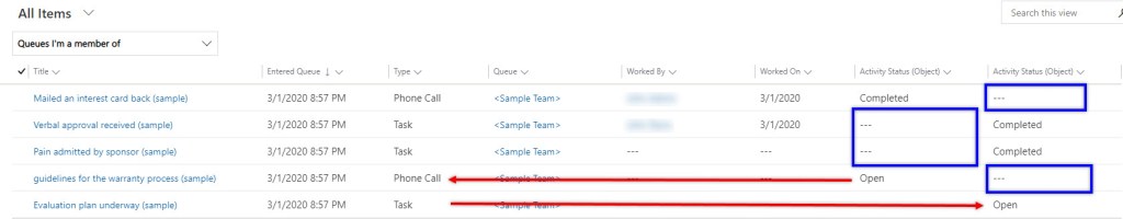 - When displaying an Activity Status in queue, it will be a separate column per activity type unless you add a custom script. This applies with other fields like Due Date, Priority and other important fields. Thus, heading to a separate view for Activities and Cases are helpful.