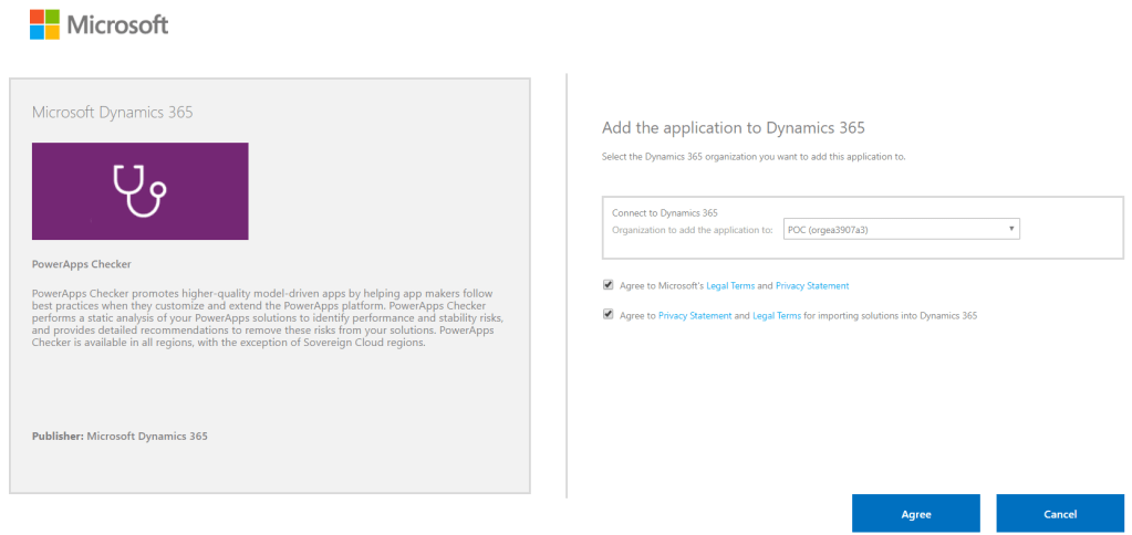 For first time users, it will show you an option to install the solution. Installing it will direct you to the AppSource site. Click on Get it now, and it will redirect you to a page where you need to select the environment you would like to use it for. Click Agree and wait.