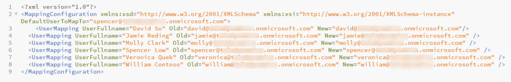 4. Go to the extracted Demo Data file (PackageDeployer_FPSDemoData_v3007) you just downloaded and open PkgFolder and then find and open ImportUserMapFile.xml. Now, paste the email address you created for each user in Office 365. Also, set the DefaultUserToMapTo= field to the email address of the Spencer Low user.
