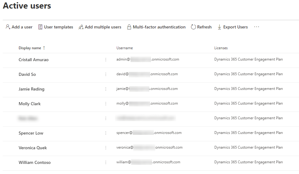 2. Create and configure users in Office 365. Make sure you assign Dynamics 365 license for each of them so their names will appear in Dynamics 365 Users list (Settings > Security > Users). Keep notes of the username you set for each of them as these are important for the configuration later on.